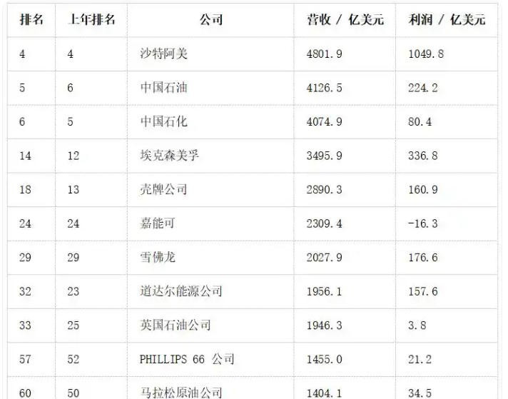 其中中国三桶油全部进入前100名,而中国石油、中国石化分别以营收4126.5亿美元、4074.9亿美元占据榜单二三位。